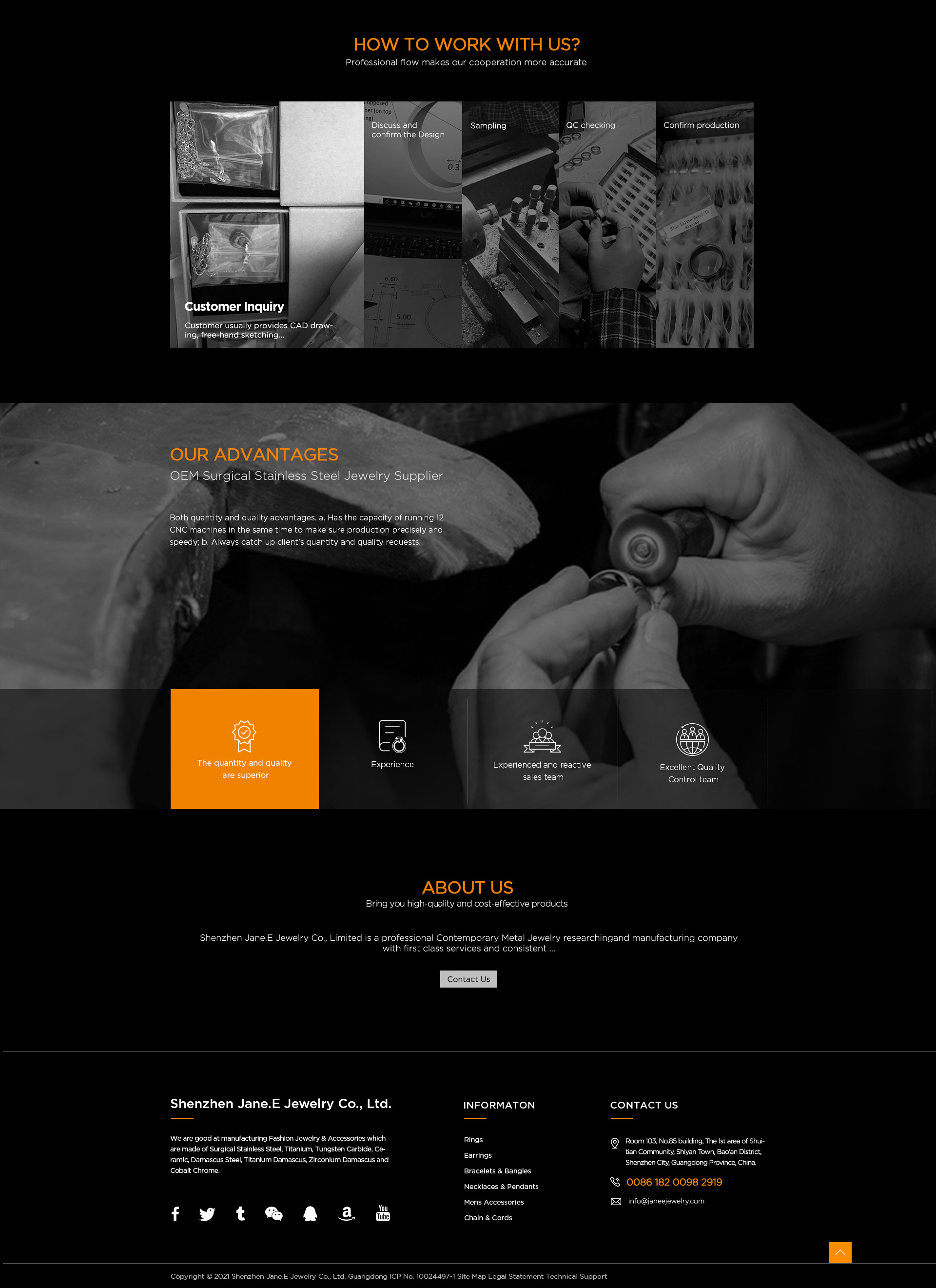 深圳市简易珠宝首饰有限公司是一家专业从事现代金属饰品研发、生产的公司,服务一流,质量稳定,价格合理。我们有能力制造时尚珠宝和配件,这些珠宝和配件由316L不锈钢、碳化钨、纯钛(99.99%)、黑锆、氧化锆陶瓷、大马士革钢、大马士革钛、大马士革锆和钴铬制成。他们通过RoHS认证。超过10年经验的手工抛光和QC团队使我们的珠宝始终满足客户的需求,没有缺陷。我们一直在与来自世界各地的客户合作,特别是在当代珠宝领域的欧洲和美国客户。我们一直期待着与来自世界各地的更多品牌所有者合作,创造和制造更多特殊的时尚珠宝。优质的产品和周到的服务使我们在过去取得了成功。目前,最重要的是坚持这些,并在未来与所有客户实现双赢。
