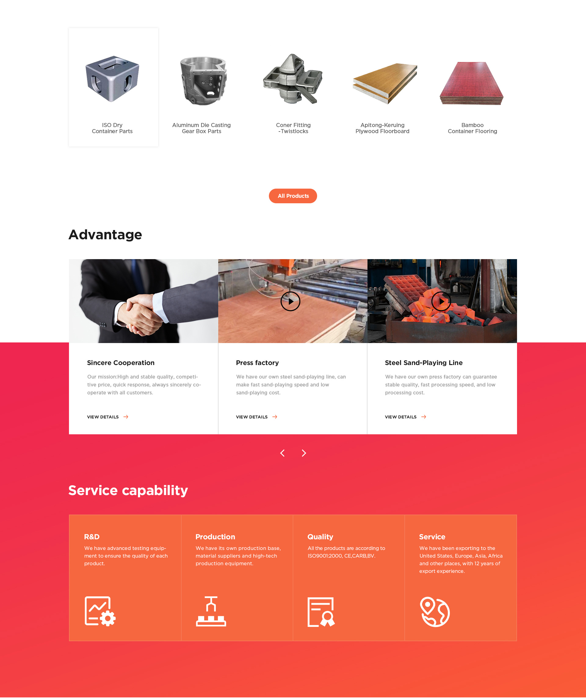 自2010年以来,我们在山东省临沂市和江苏省江门市拥有自己的集装箱胶合板地板厂,在上海和广州拥有自己的iso干集装箱备件厂,在广州和广东省江门市有自己的iso角铸件厂。然后在2015年,我们将业务扩展到可拆卸集装箱房、扁平包装集装箱房、可折叠集装箱房、扩展房、预制房和警卫室,我们在苏州有工厂生产这些产品。2018年,我们拥有自己的工厂,生产模具生产、锌铝合金压铸、冲压、数控加工、数控冲压和塑料注射,以满足全球所有客户的需求。