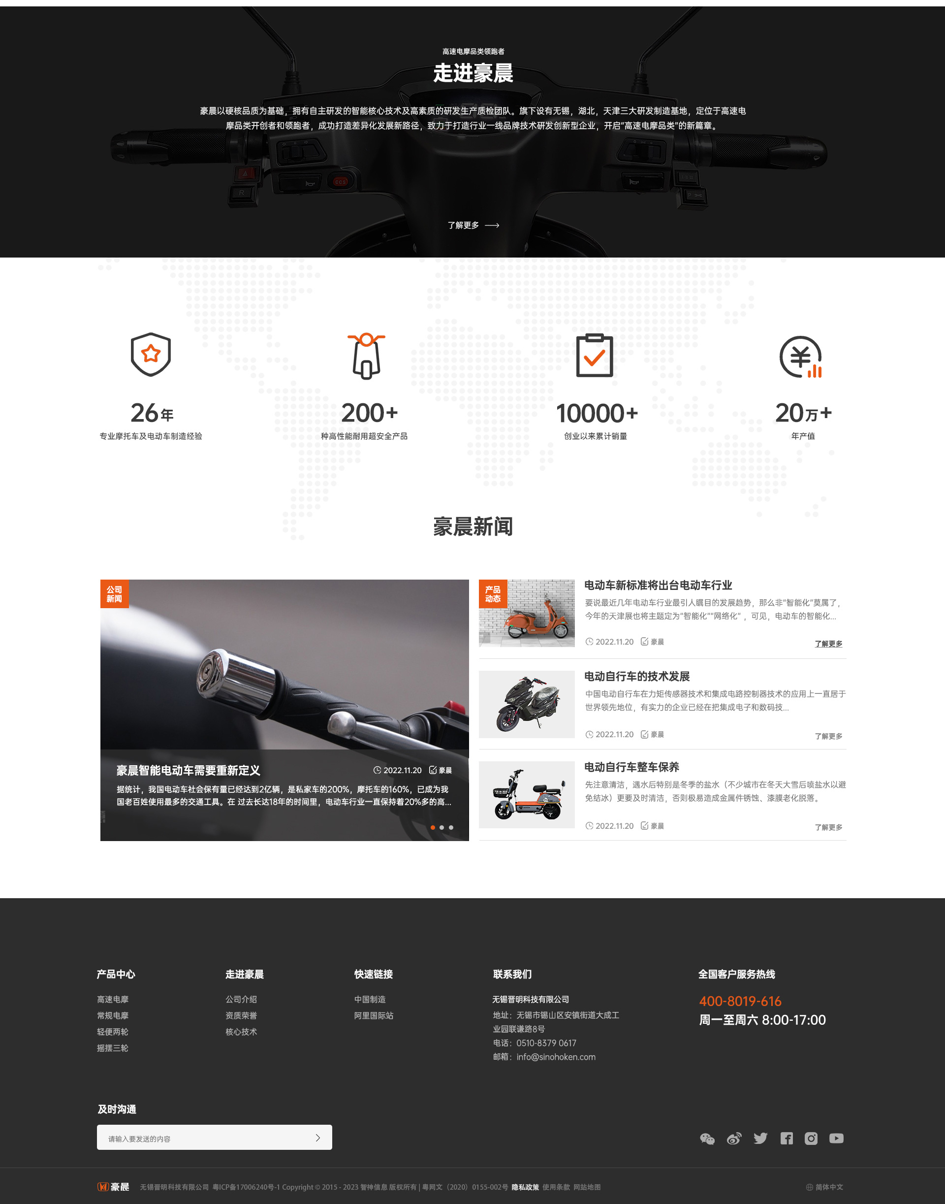 豪晨创立于1996年,拥有26年专业摩托车及电动车制造经验。豪晨是国家工信部公告目录内的电动车品牌,产品涵盖全系高速电摩,常规电摩,摇摆三轮等三大品类,助力创造绿色低碳出行新生活。 豪晨以硬核品质为基础,拥有自主研发的智能核心技术及高素质的研发生产质检团队。旗下设有无锡,湖北,天津三大研发制造基地,定位于高速电摩品类开创者和领跑者,成功打造差异化发展新路径,致力于打造行业一线品牌技术研发创新型企业,开启“高速电摩品类”的新篇章。